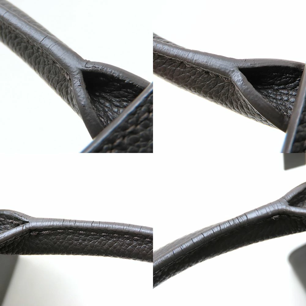 [外・表面] 使用感あり [外・ハンドル] コバにヒビ割れ [外スト・ショルダー] コバヒビ割れ [外・形状] 凹み [外・角] キズ / スレ / コバにヒビ割れ [外・縁] コバにヒビ割れ [金具部分] キズ / 一部剥がれ [内側] スレ / 汚れ / 全体的に使用感あり / 底面に所々ラメ汚れあり