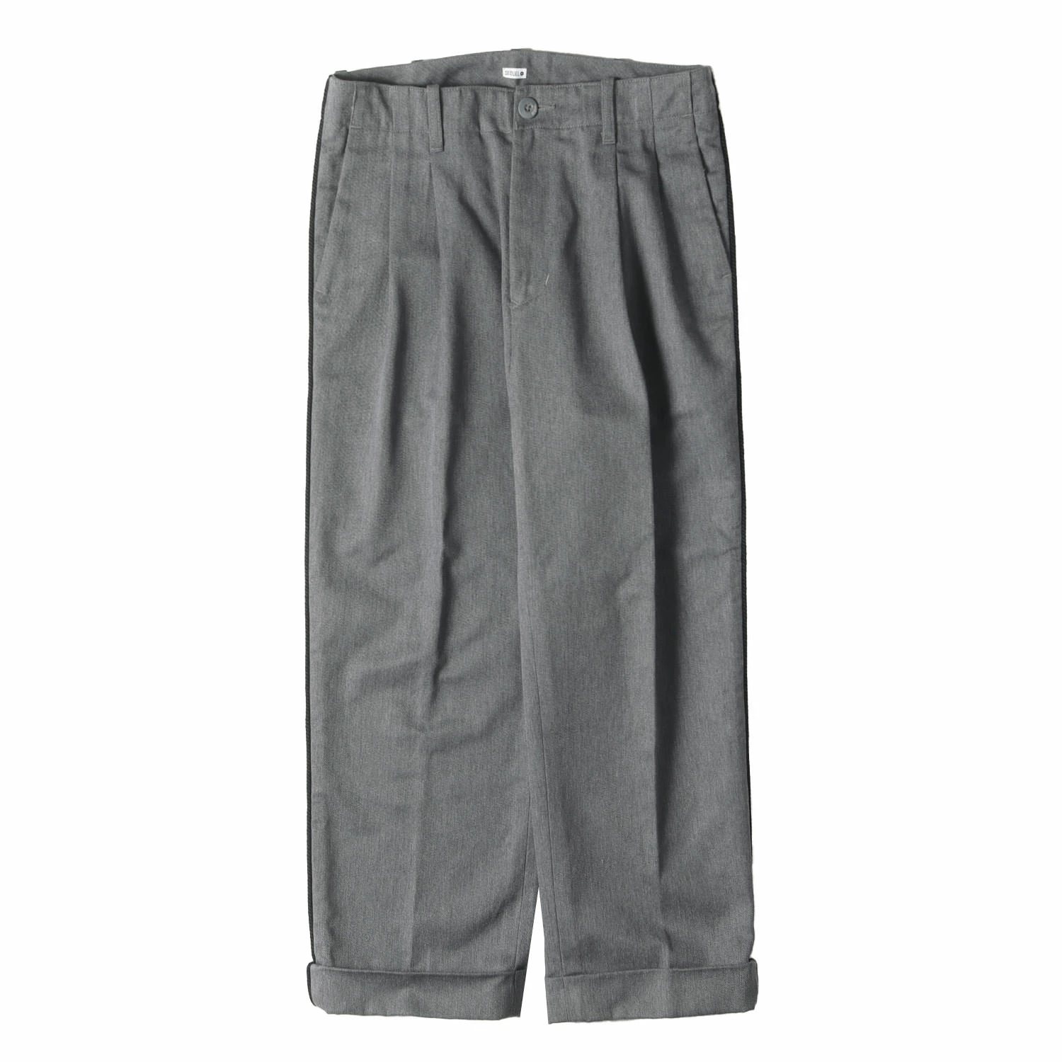 | 商品説明 | 厚手のT/Cツイル生地を使用し、サイドにパイピングラインをあしらったジッパーフライチノパンツです。こちらは2タックの入ったワイドテーパードシルエットのTYPE-Cモデルになります。 |