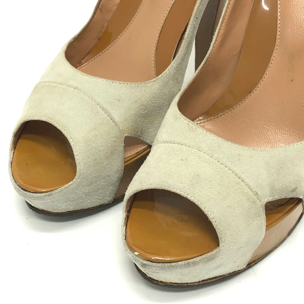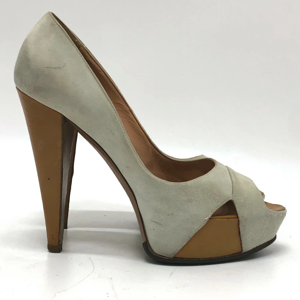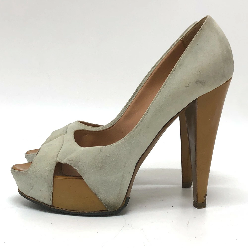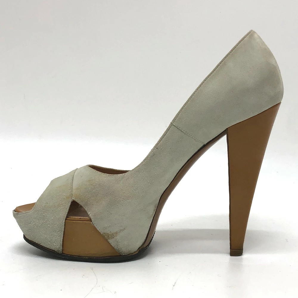 Pre-owned Sergio Rossi open-toe platform cone heel pumps in gray suede for women.