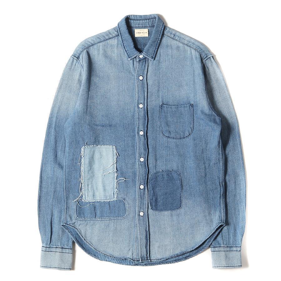 コットンデニム生地を使用し、パッチワークデザインがあしらわれた長袖シャツです。