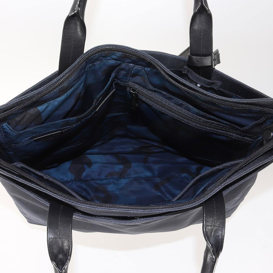 - こちらは“TUMI”とコラボした多機能ビジネスバッグです。裏地にはブルーカモ柄がデザインされております。
