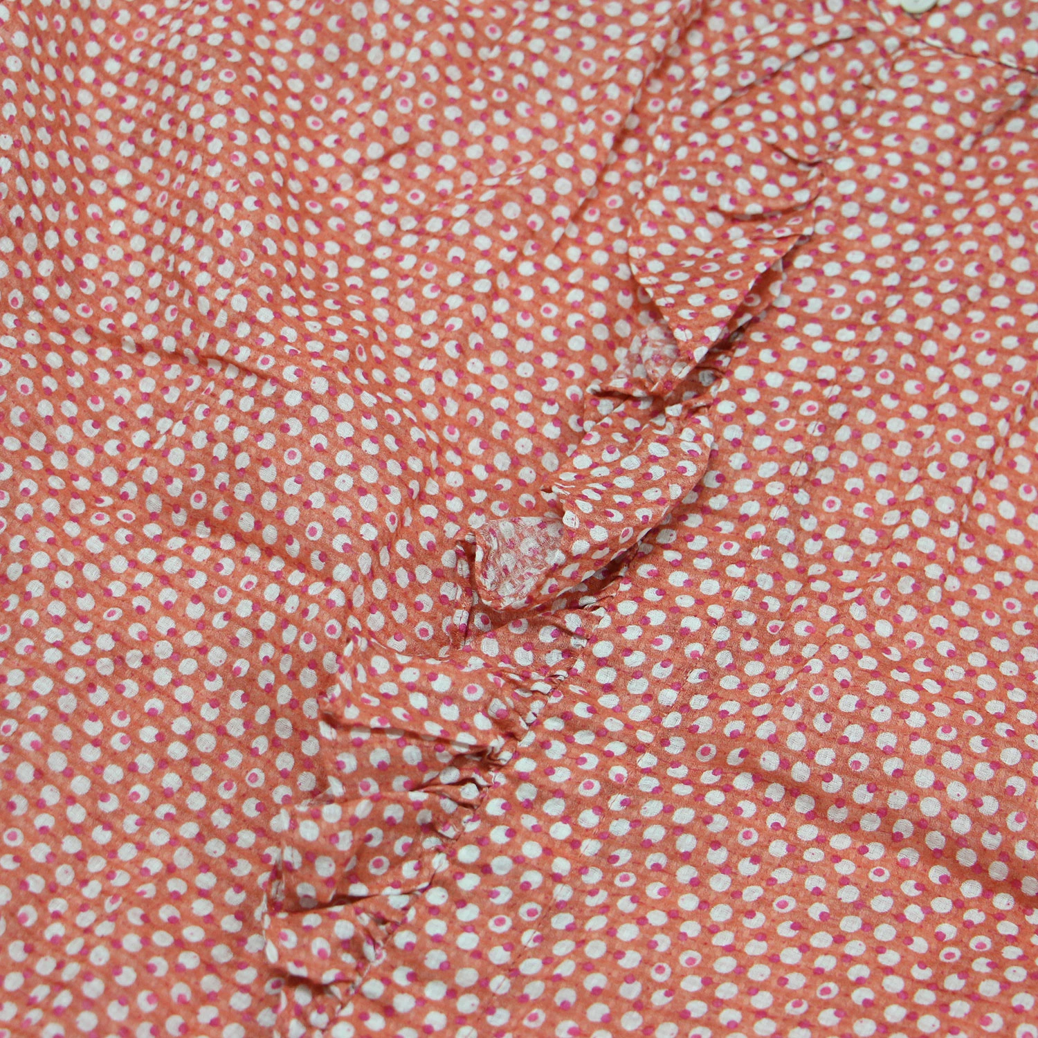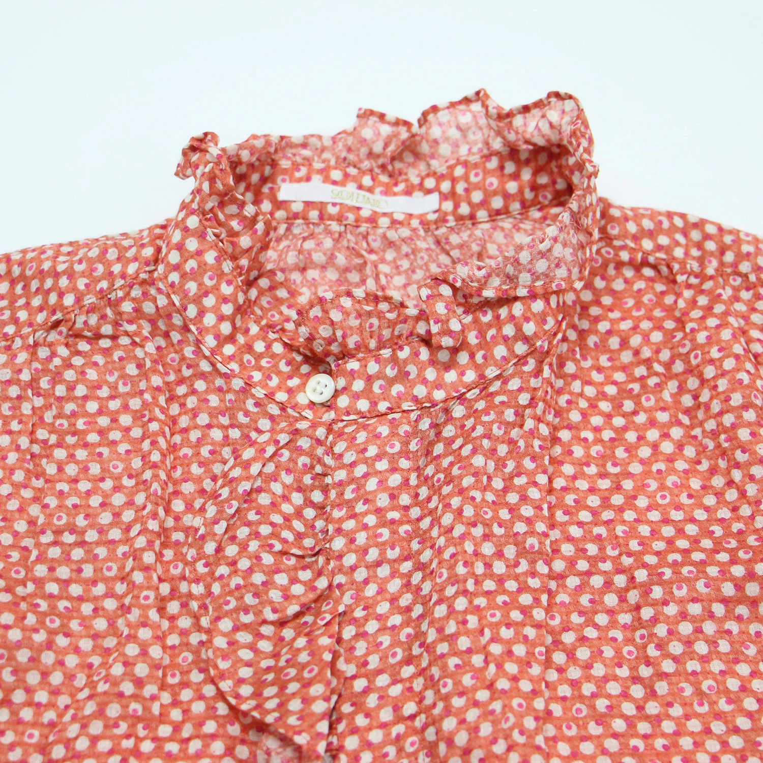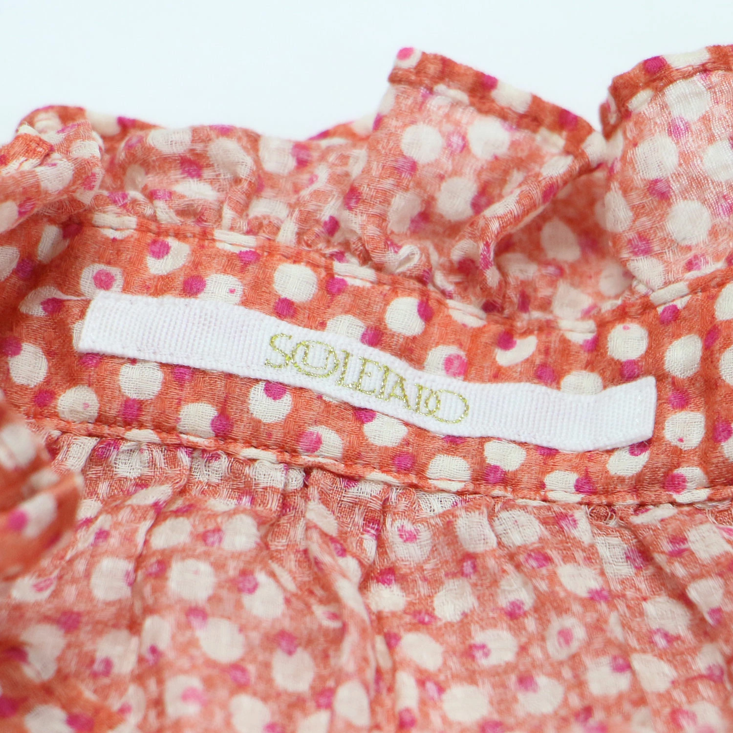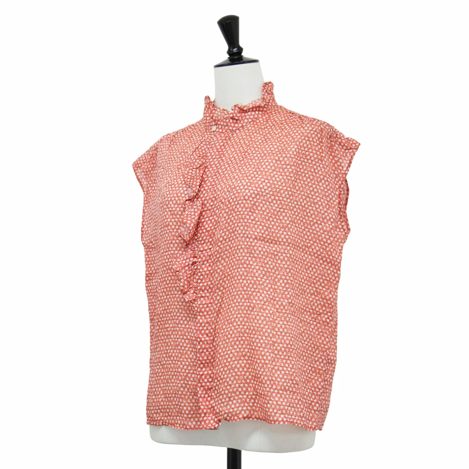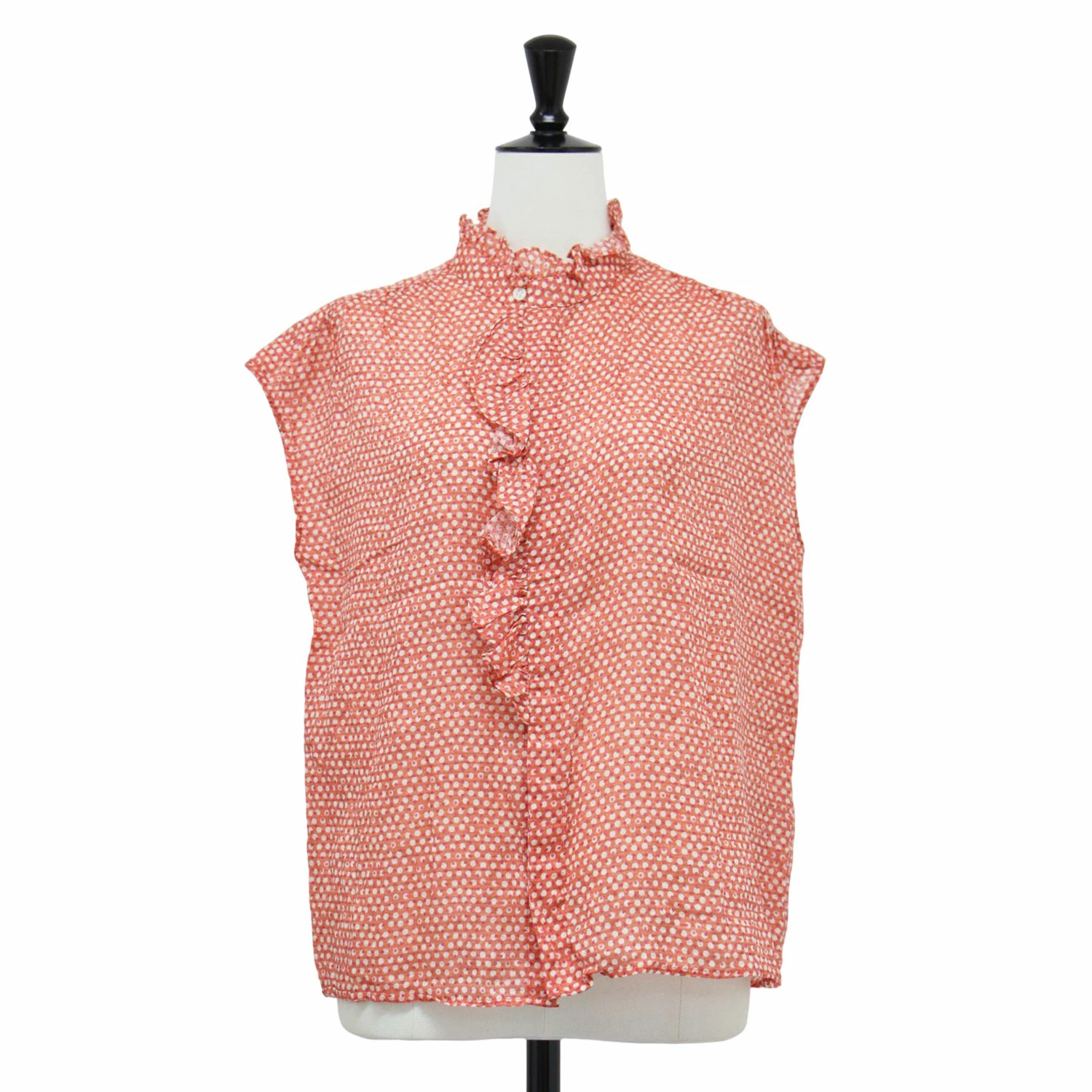 SOULEIADO Orange Blouse, Size 36 (Size 9) | Spring/Summer 2024 Cotton Ramie Print Frill Neck Blouse/Shirt | Sleeveless, High Neck, Hidden Buttons, Linen | Made in Japan | Women's Top | Pre-owned | [K4614]