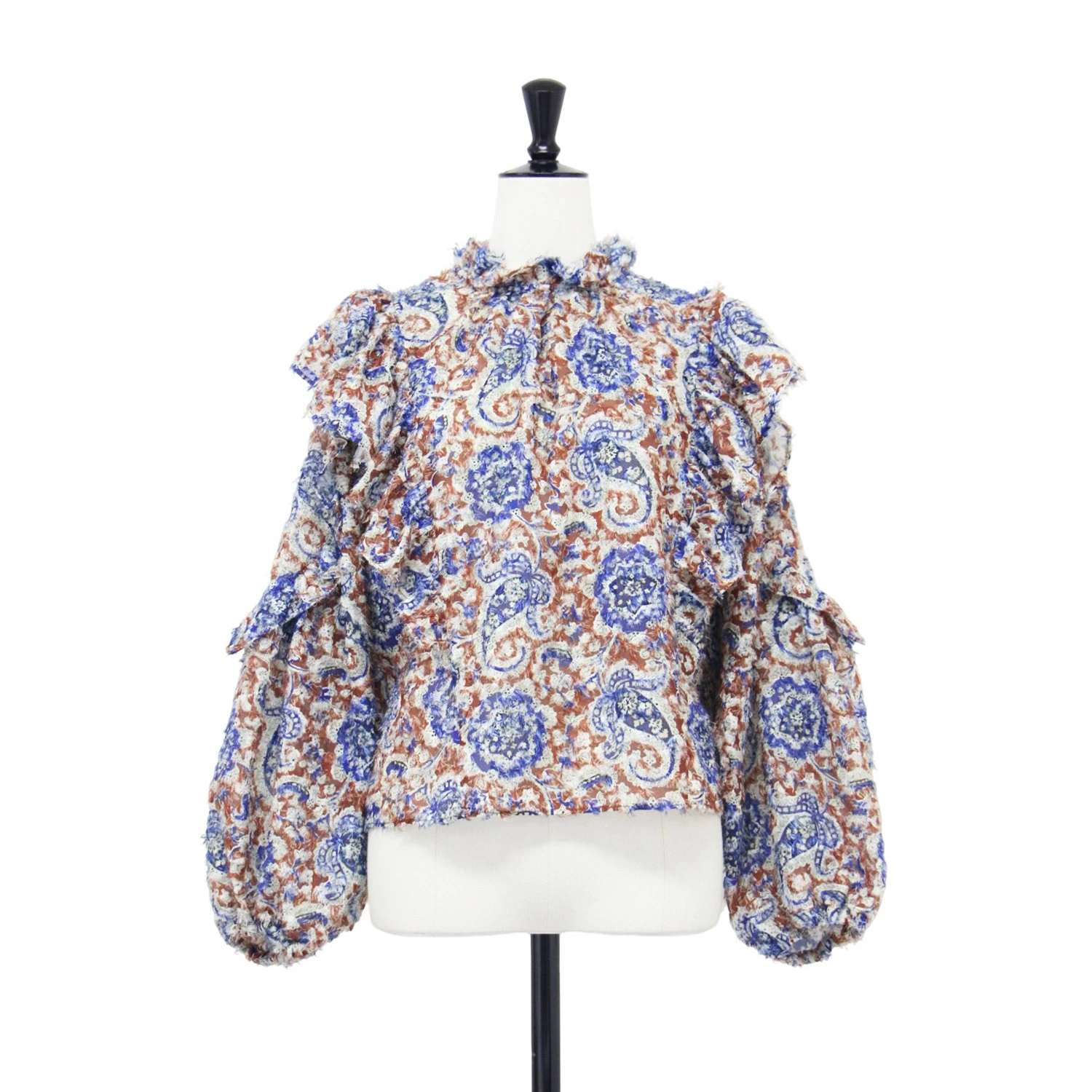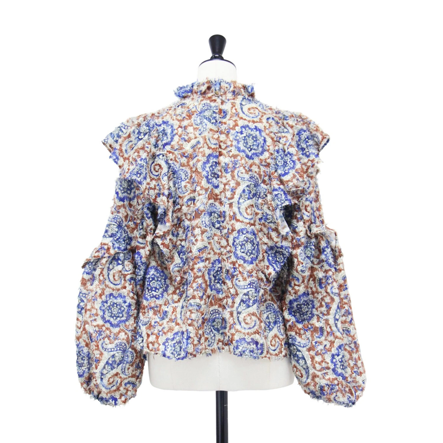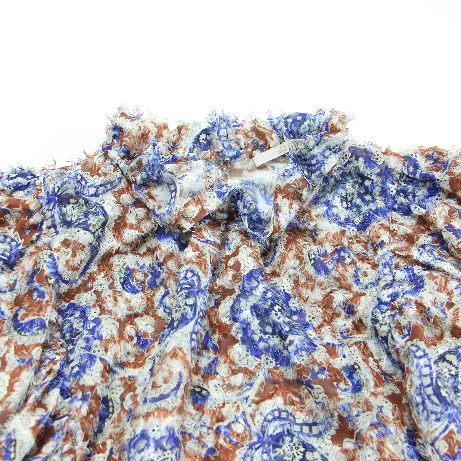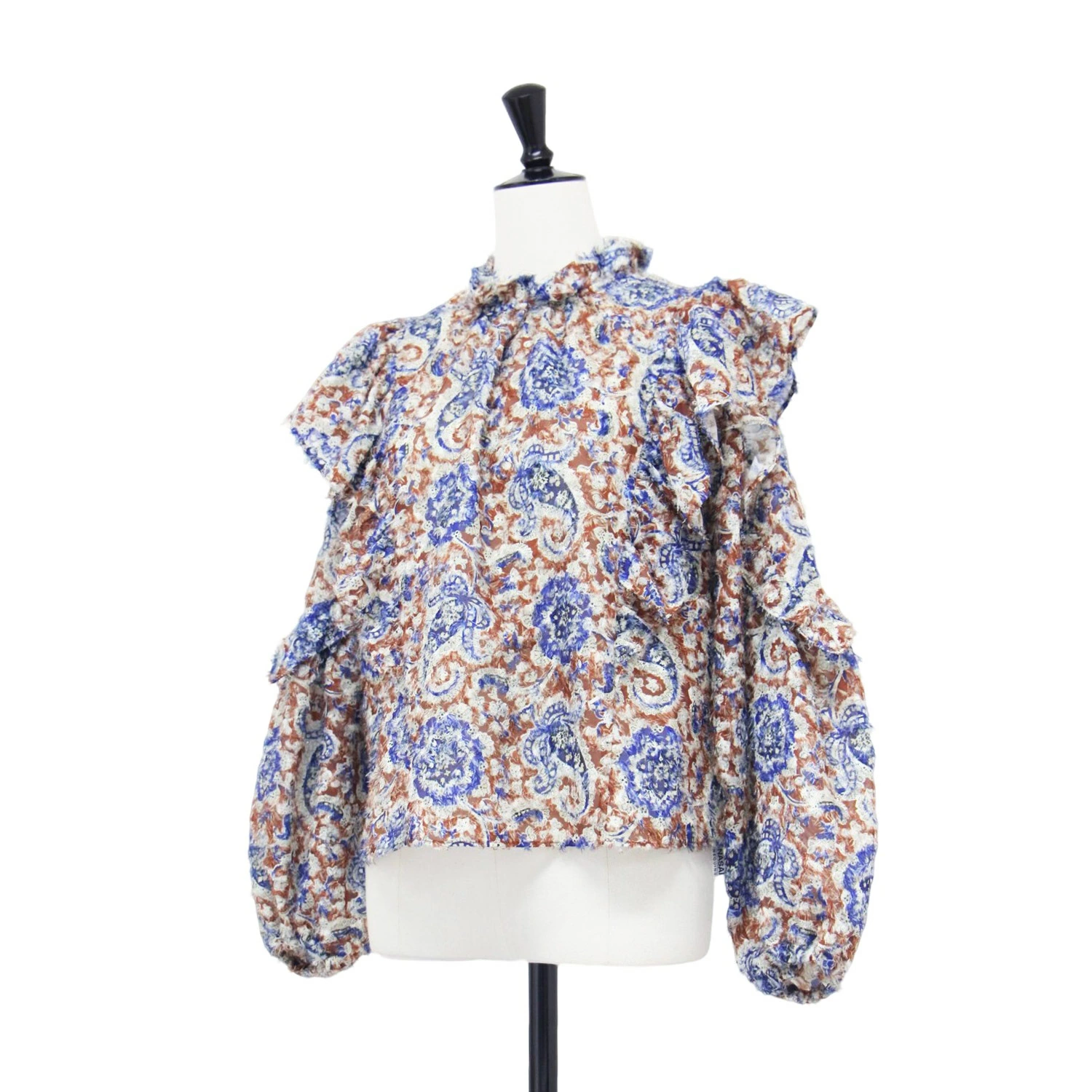 SOULEIADO Blouse, Brown, Size 36 (Size 9) | Fall/Winter 2024 Polyester Printed Gathered Ruffle Blouse/Shirt | Pullover, Short Length, Long Sleeves, Voluminous Sleeves, Shag | Women's Top | Pre-owned | Excellent Condition | K4650