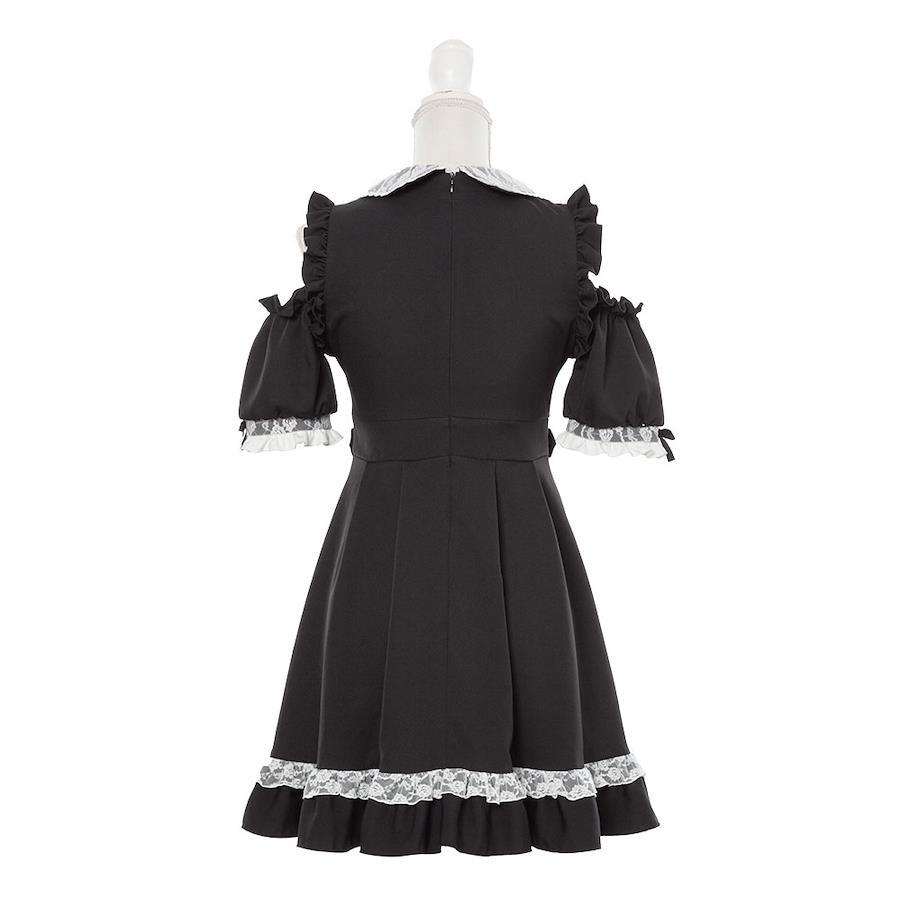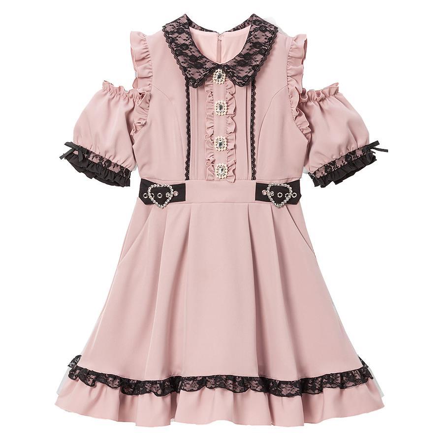キラキラ輝くビジューたっぷり♪主役は私たち!オフショルワンピース【デザイン】キラキラたっぷりビジューボタンにウエストのベルトのキラキラハートが目を惹く可愛すぎるオフショルワンピースが登場しました♪襟とカフスにはレースを重ねてさらに可愛く、裾フリルにもポイントでレースがございます。どこから見てもかわいいワンピース、これで主役はあなた♪脇のベルトは少し調整が可能になっています。【素材】しっかりとした素材です。本体に裏地付き。後ろファスナーでの着脱となります。【コーディネート】量産型や地雷系コーデにぴったりのアイテムです。キラキラと映えるポイントたっぷりで目立つこと間違いなし!イベント参戦コーデや双子コーデにもオススメです♪《透け感》なし 《生地の厚さ》普通 《裏地》あり 《伸縮性》なし《生産国》中国