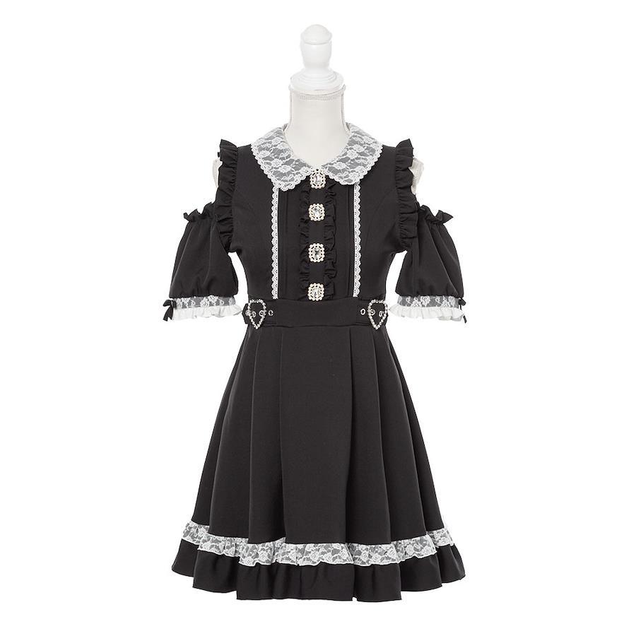 キラキラ輝くビジューたっぷり♪主役は私たち!オフショルワンピース【デザイン】キラキラたっぷりビジューボタンにウエストのベルトのキラキラハートが目を惹く可愛すぎるオフショルワンピースが登場しました♪襟とカフスにはレースを重ねてさらに可愛く、裾フリルにもポイントでレースがございます。どこから見てもかわいいワンピース、これで主役はあなた♪脇のベルトは少し調整が可能になっています。【素材】しっかりとした素材です。本体に裏地付き。後ろファスナーでの着脱となります。【コーディネート】量産型や地雷系コーデにぴったりのアイテムです。キラキラと映えるポイントたっぷりで目立つこと間違いなし!イベント参戦コーデや双子コーデにもオススメです♪《透け感》なし 《生地の厚さ》普通 《裏地》あり 《伸縮性》なし《生産国》中国