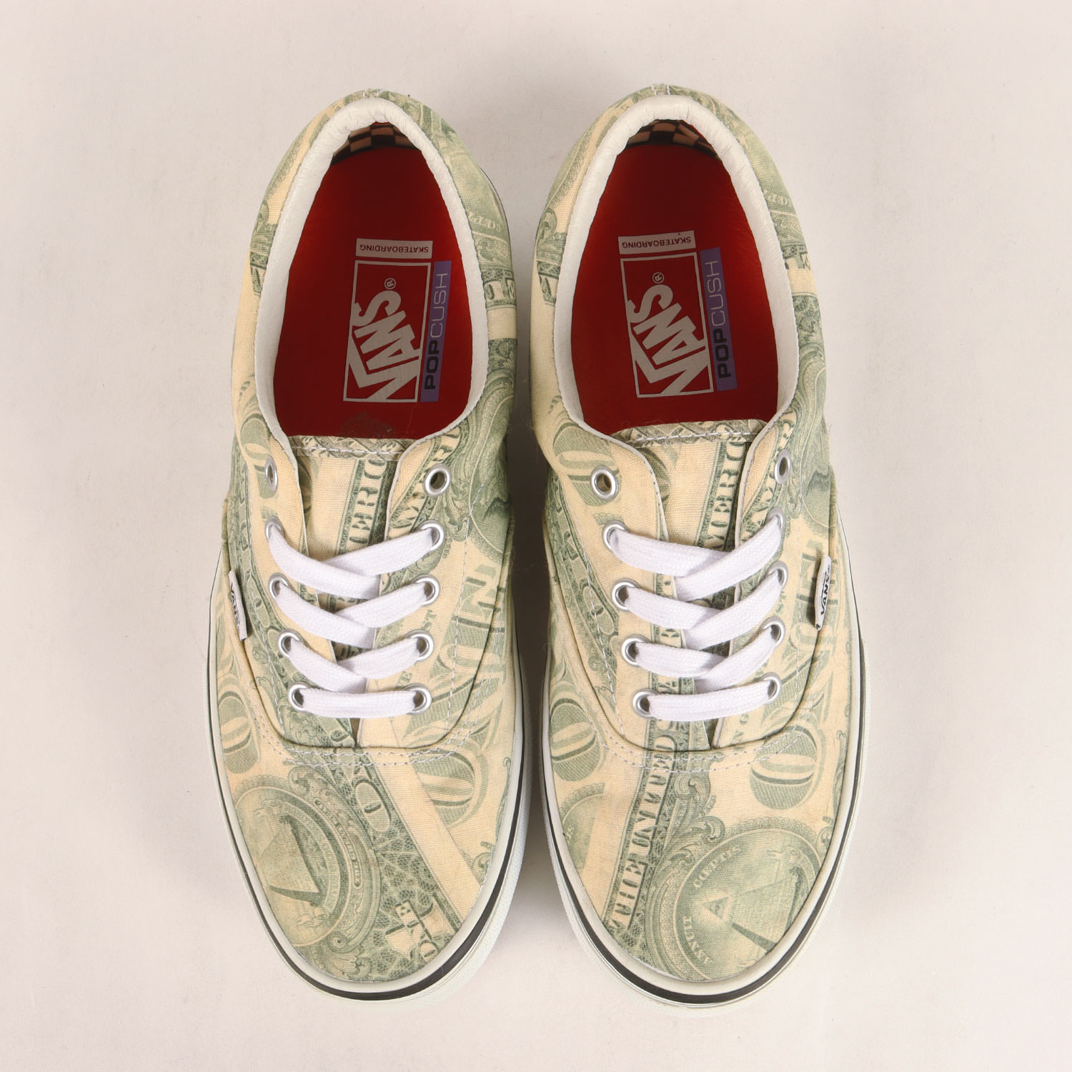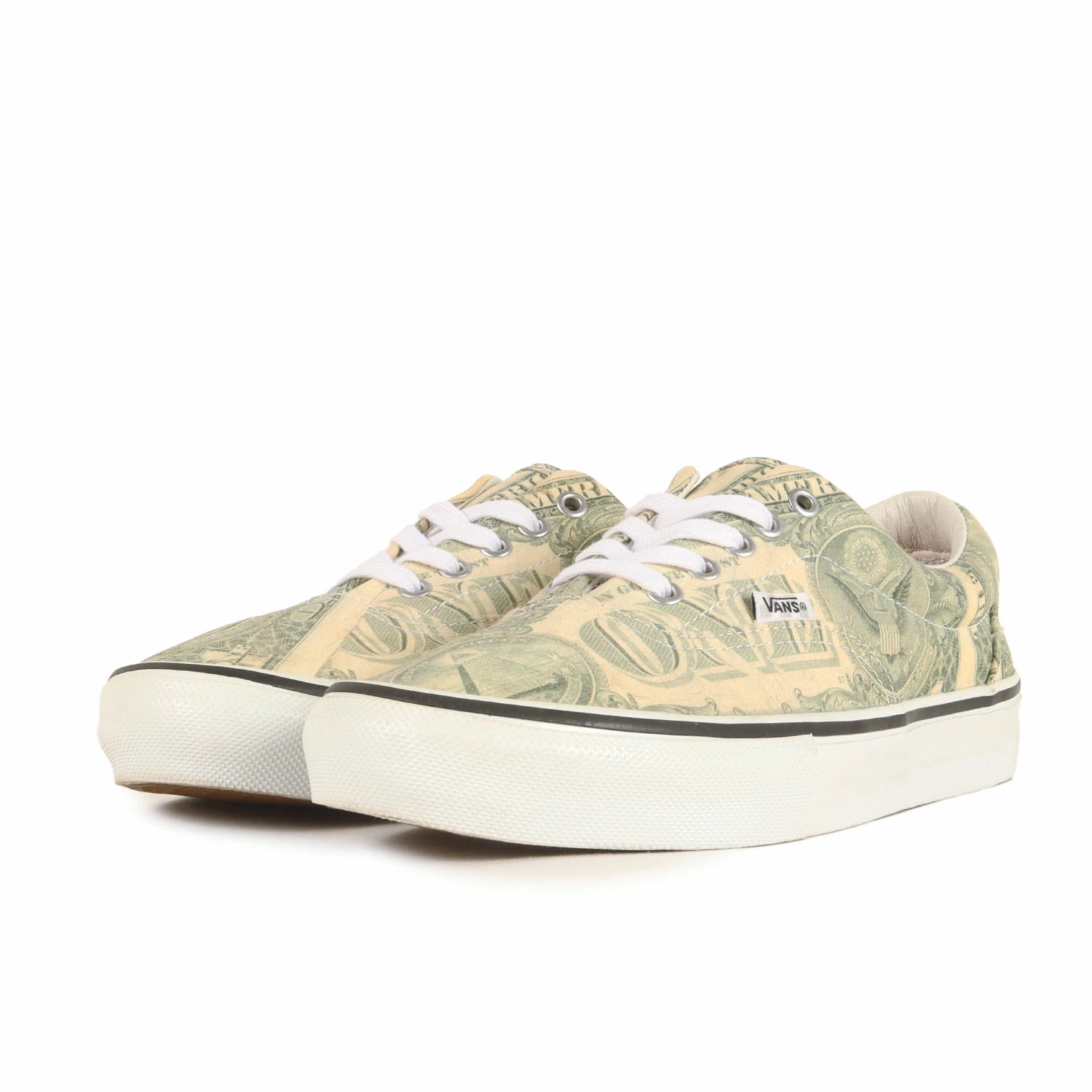 商品説明毎期定番の“VANS(バンズ)”とのコラボアイテムです。モデルにはキャンバス素材の“ERA(エラ)”を採用し、全体に米ドル札のプリントをデザインした一足になります。