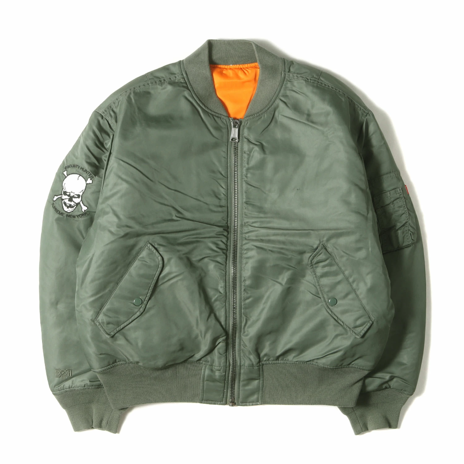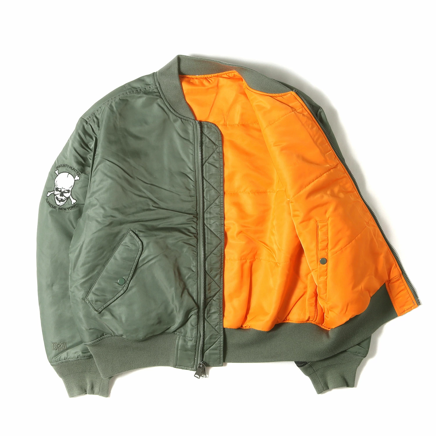 | 商品説明 | 90年代から続く裏原ブランド“BOUNTY HUNTER”とのコラボシリーズです。こちらは袖をロゴプリント入りのバックサテン生地で切り替えしたMA-1ジャケットになります。 |
