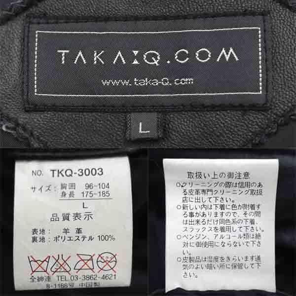 ・メーカー :TAKA Q / タカキュー・製品型番 :TKQ-3003・サイズ :表記サイズ:L,肩幅 (約cm):47,身幅 (約cm):58,着丈 (約cm):68,袖丈 (約cm):59.5,・色(柄)の系統:ブラック・デザイン :(メンズ)アウター/ジャケット・素材 :表地:羊革 裏地:ポリエステル100%