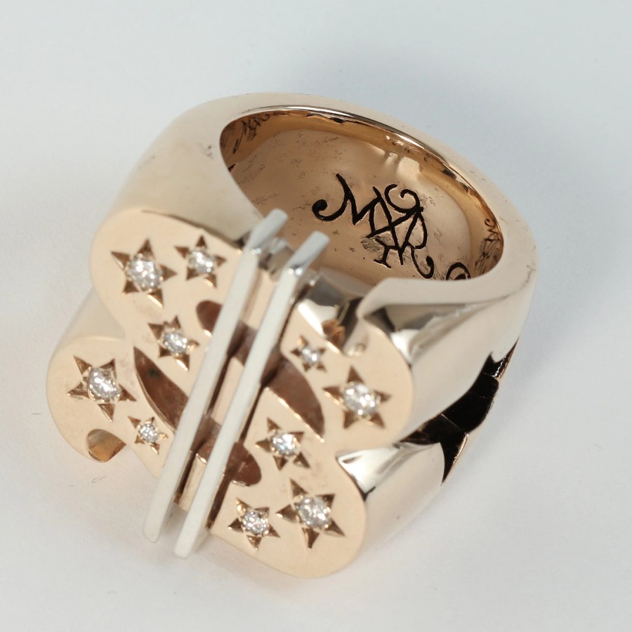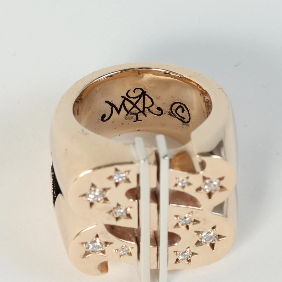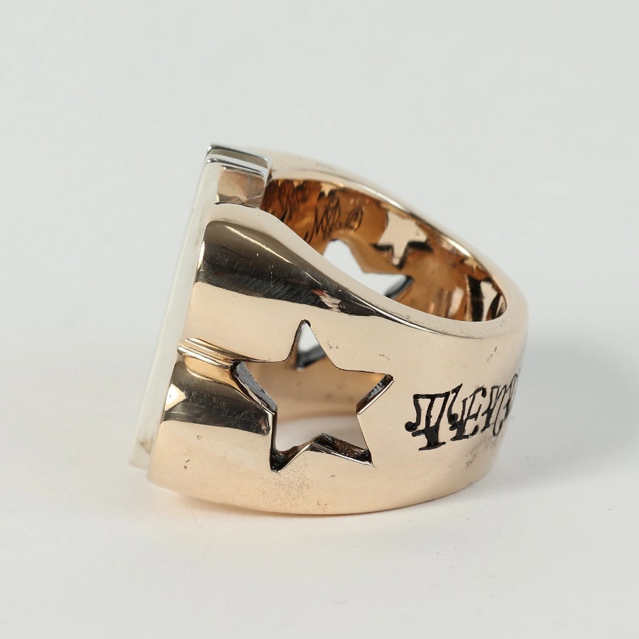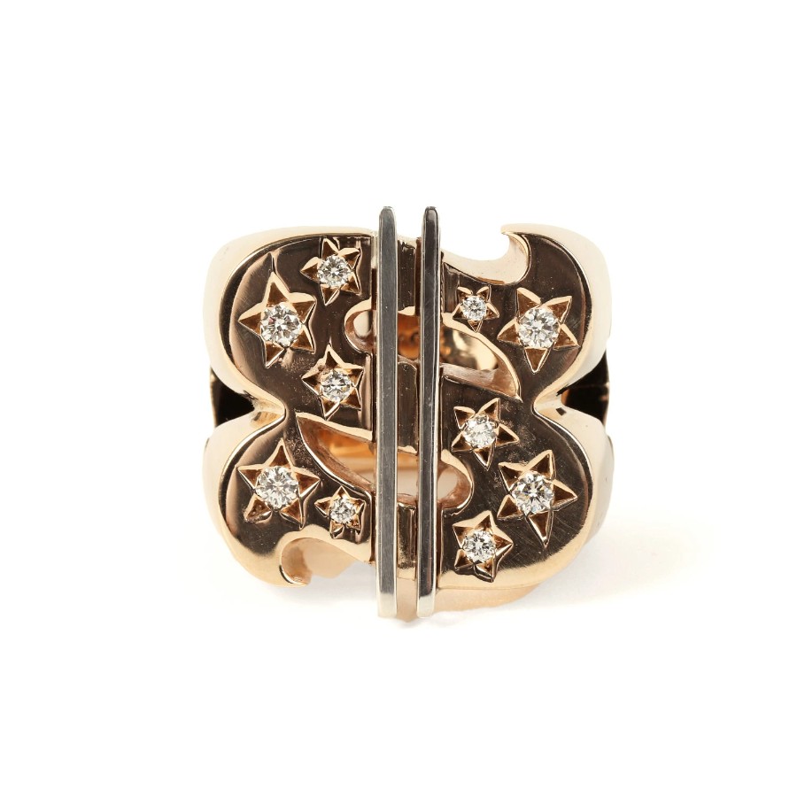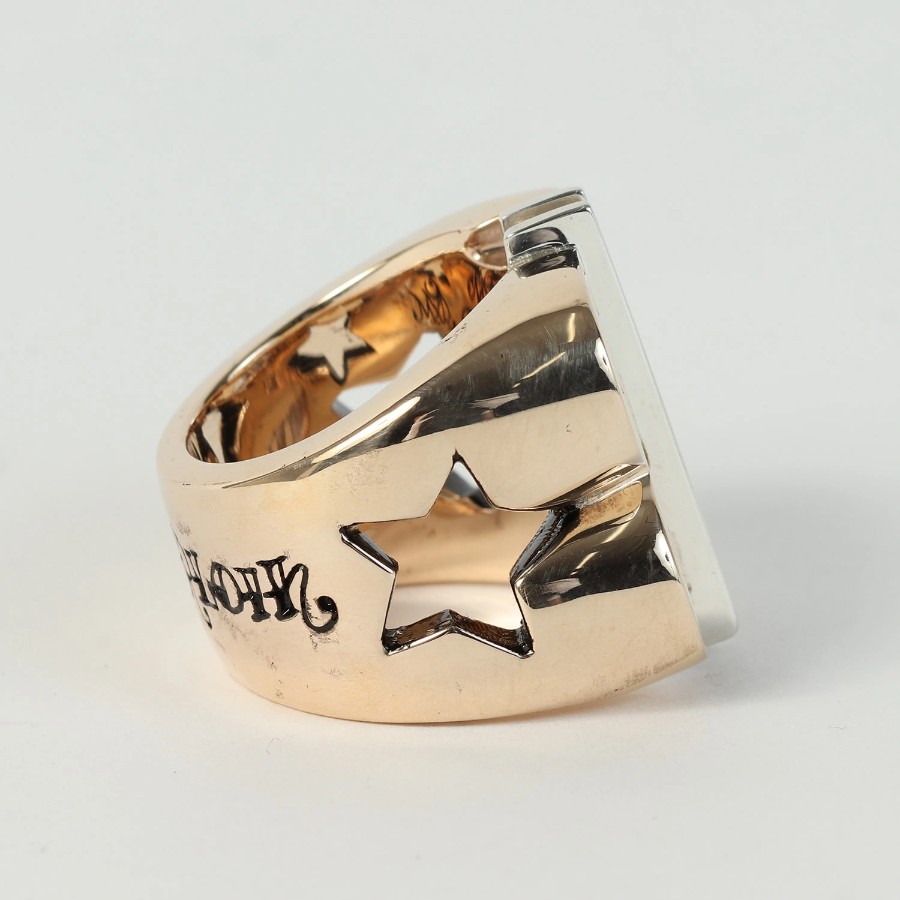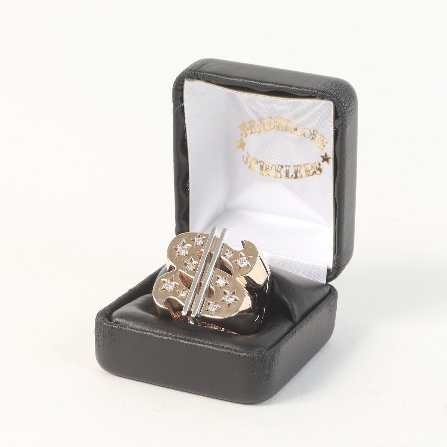 - ドルマークをモチーフにしたボリュームのあるデザインです。こちらはK8ゴールドを使用し、スターの中にダイヤモンドを装飾した最上級アイテムになります。