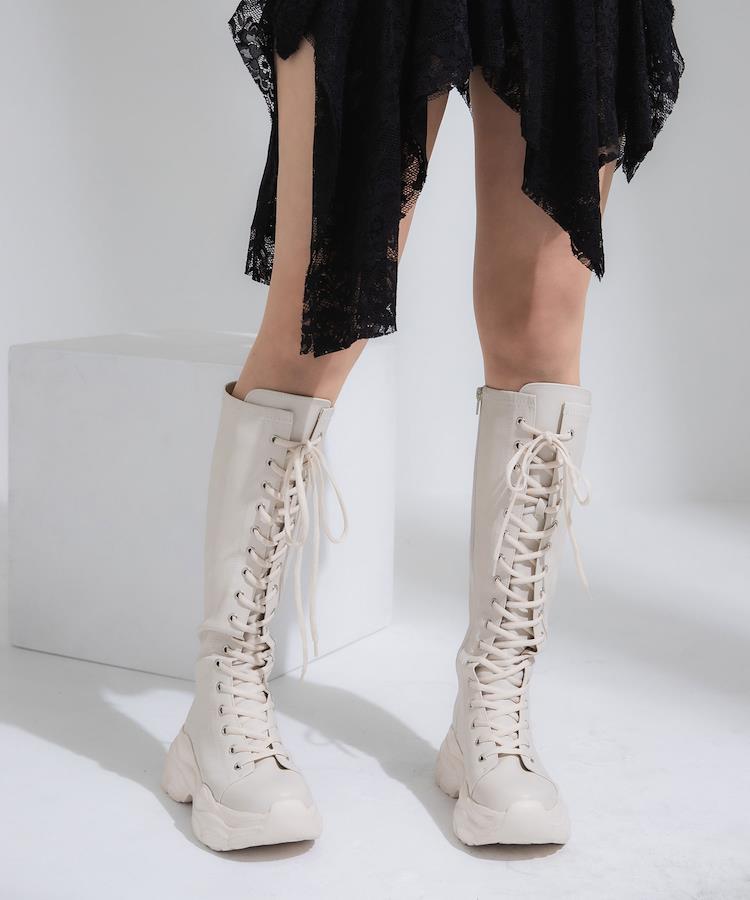 【デザイン】厚底とインヒールの組み合わせで8cmも身長アップ!クラシカルなレースアップデザインを取り入れつつ、現代的なボリューム感がトレンド感を演出。細身シルエットの筒丈はストレッチ性があり履きやすく脚にしっかりフィットしてくれるのでスタイルアップしながら存在感抜群のブーツです。ボリュームがありながら軽量なので、スニーカーを履いているような感覚で履けるブーツです。