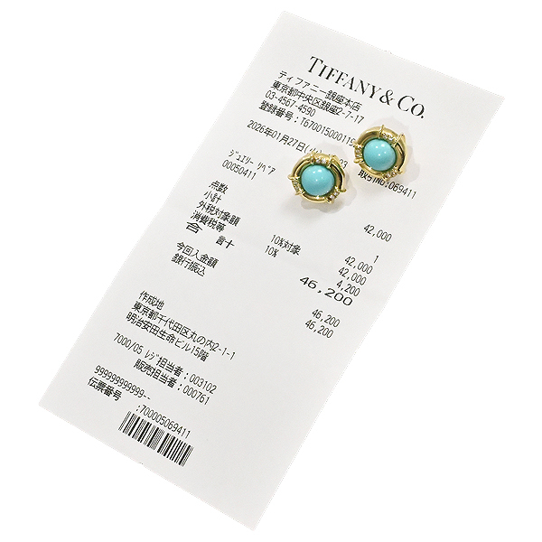 Category: JewelryType: EarringsBrand Name: Tiffany & Co.Size: 17.9 × 16.5 × 15.8mmGemstone: Turquoise/DiamondHallmark: 1986 TIFFANY&Co. 750 15*Weight: 11.4gMaterial: K18YG (18k Yellow Gold)Retail Price: -Accessories: Our original box, repair receiptCondition: A