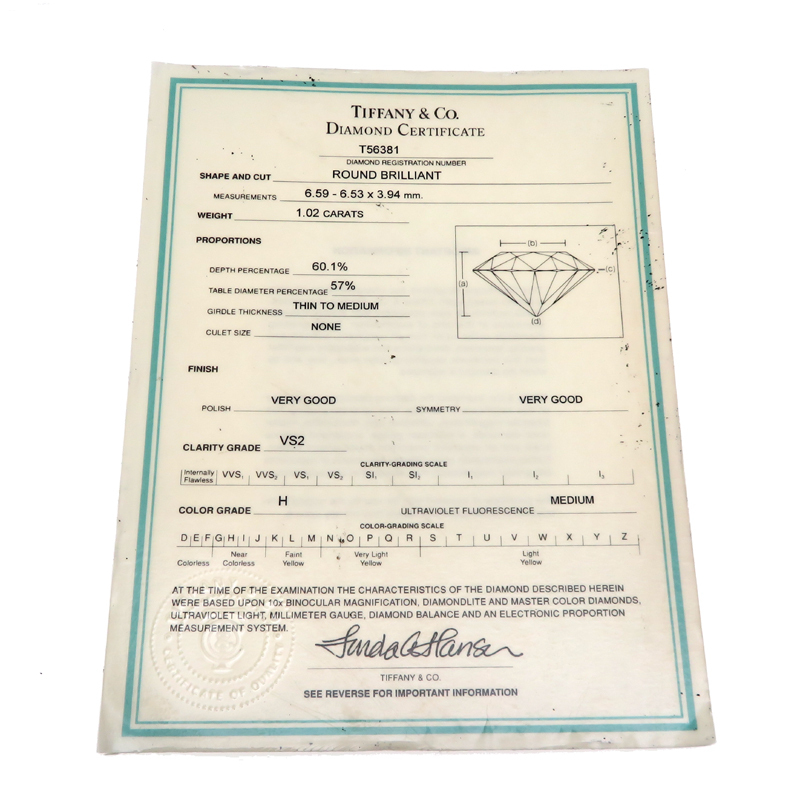 Material: Pt950 PlatinumAccessories: Tiffany & Co. Certificate of AuthenticityCondition: Used: ARing: There are some minor scratches visible with a magnifying glass, but the item is in good condition.Certificate of Authenticity: Some stains.*Please inquire before ordering if you are concerned about the detailed condition of the accessories. Stone Type: Diamond 1.02ctClarity: VS2Color: HCut Overall Rating: VERY GOODThe actual color of the product may differ from what you see on your screen or display.