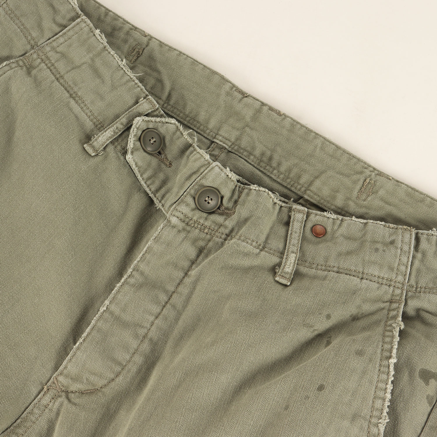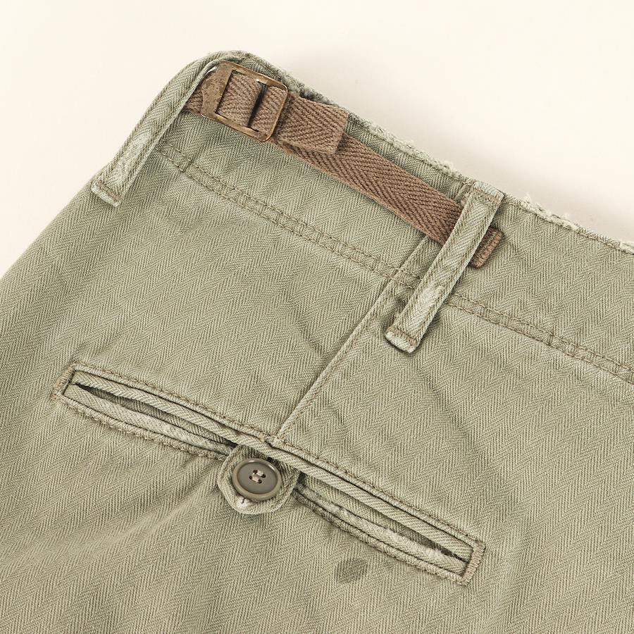 ヘリンボーンツイル生地を使用し、ヴィンテージ&ドリップ加工を施したボタンフライカーゴパンツです。ローライズのスリムシルエットで仕上げた一本になります。