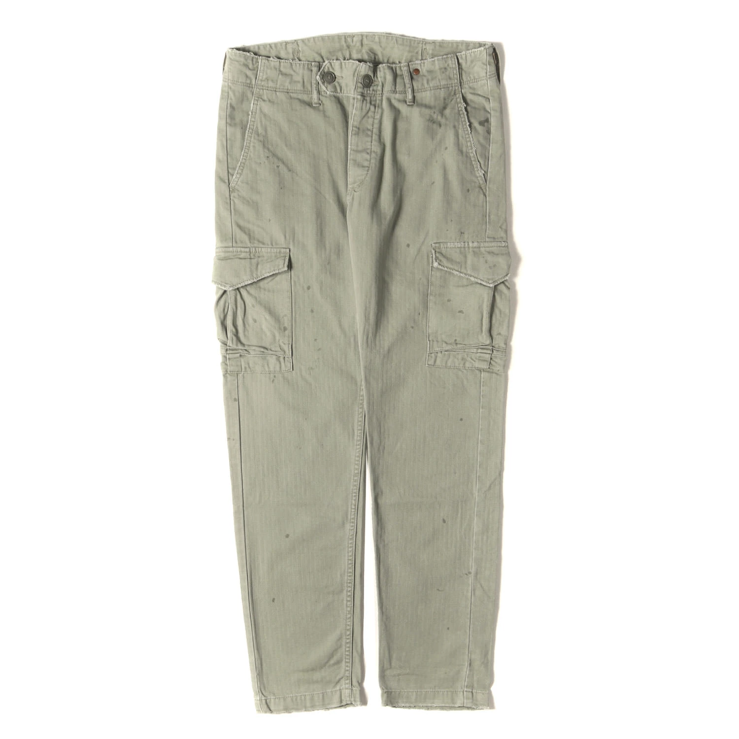 商品説明ヘリンボーンツイル生地を使用し、ヴィンテージ&ドリップ加工を施したボタンフライカーゴパンツです。ローライズのスリムシルエットで仕上げた一本になります。