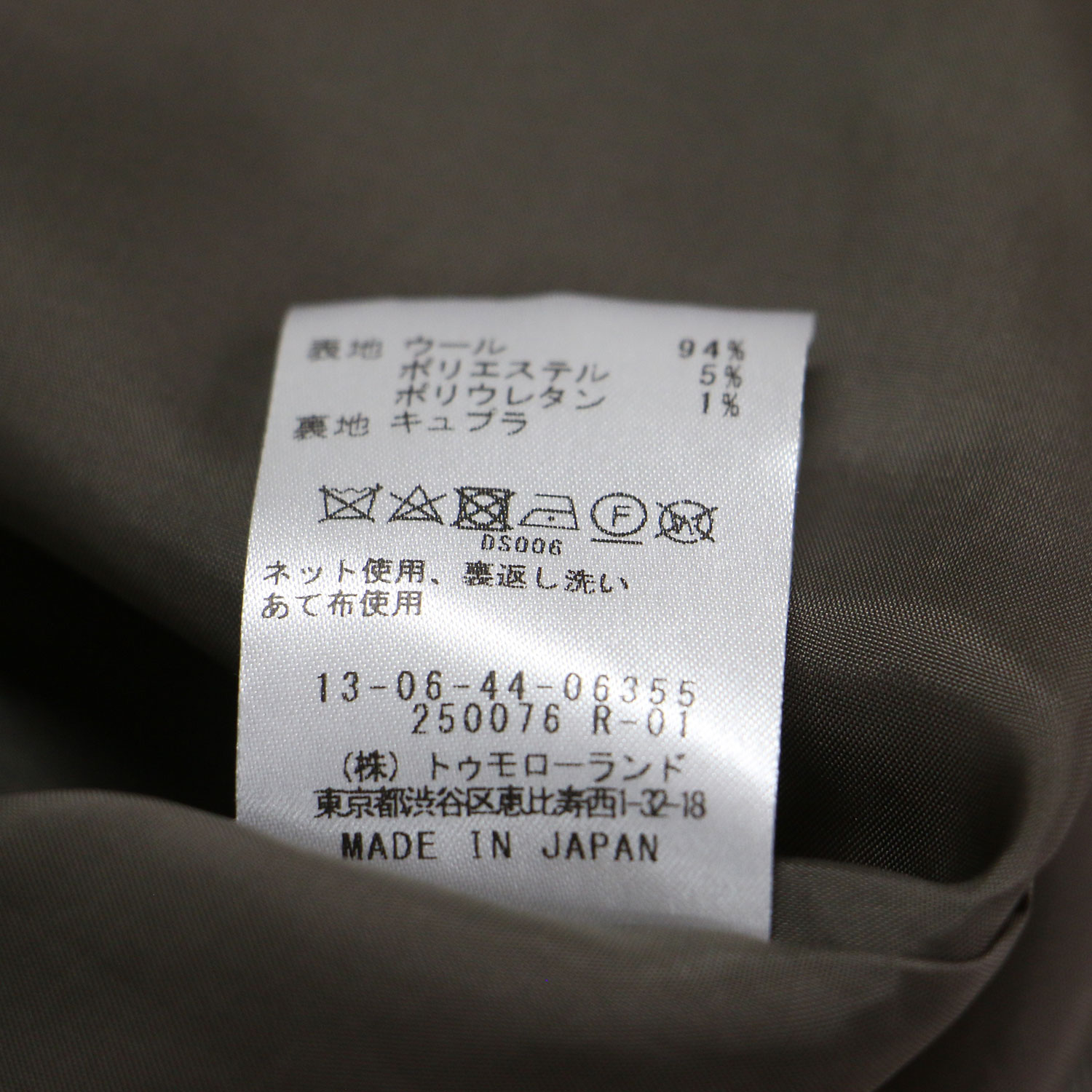 - 表地 ウール 94% ポリエステル 5% ポリウレタン 1% 裏地 キュプラ