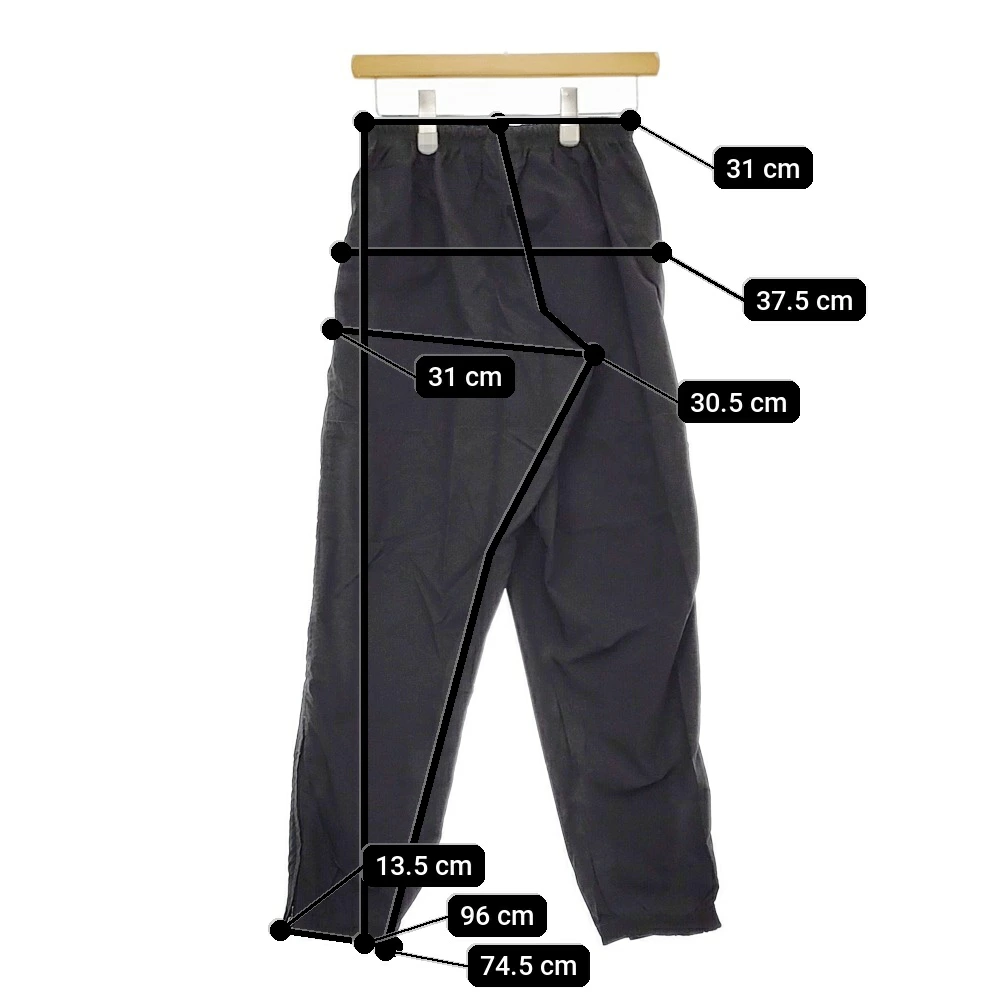 実寸サイズ | 総丈:約96cm ウエスト:約31cm ウエスト最長:約49cm 股上:約30.5cm 股下:約74.5cm ヒップ:約37.5cm ワタリ幅:約31cm 裾幅:約13.5cm 備考 スリット:ジップタイプ ※記載以外のサイズが合わないことを理由とした返品はできませんので、 記載部分以外で実寸サイズの気になる箇所があれば必ず購入前にご質問ください。 |