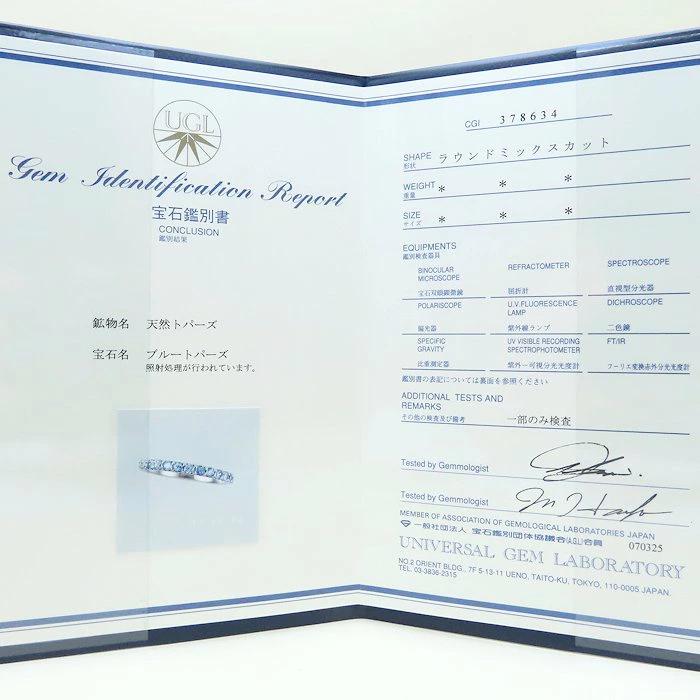| | 重量 | 1.5g | | 付属品 | 鑑別書(UGL発行) | | 備考 | ブルートパーズ ※照射処理が行われています