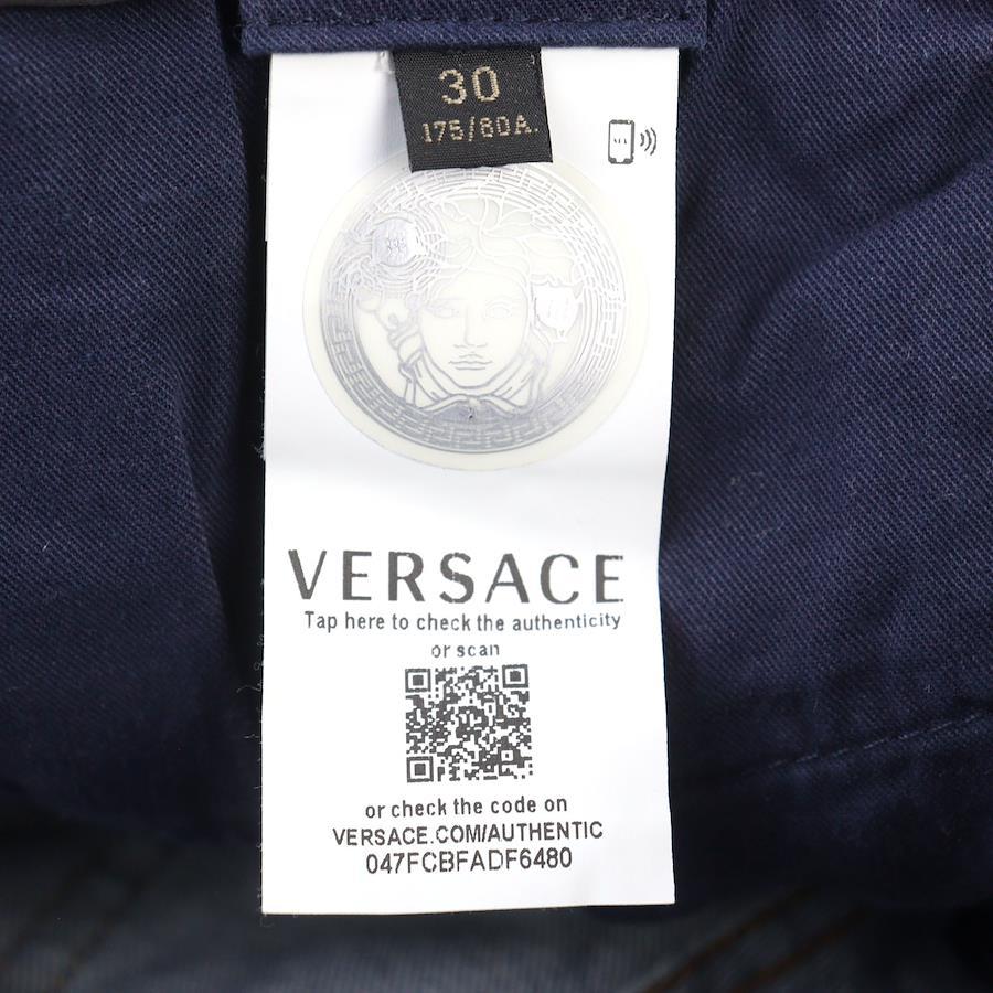 VERSACE denim pants with Medusa hardware, logo tab, and leather patch. Light blue cotton and polyester. A85190