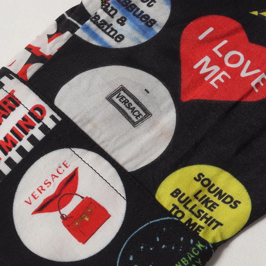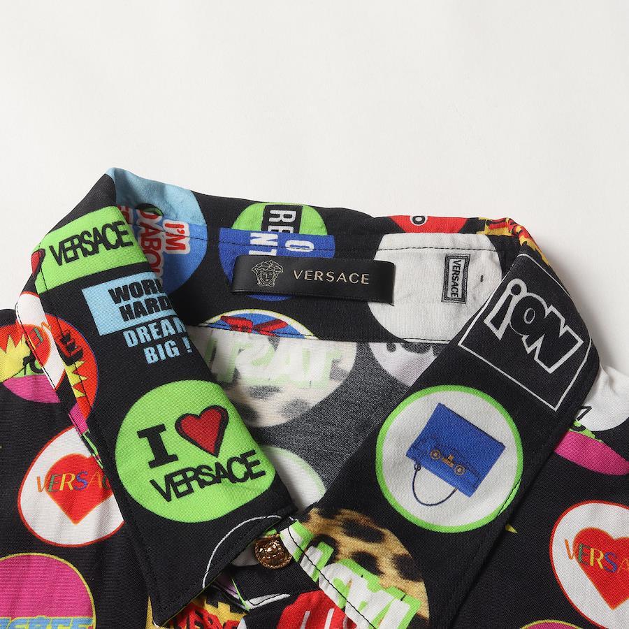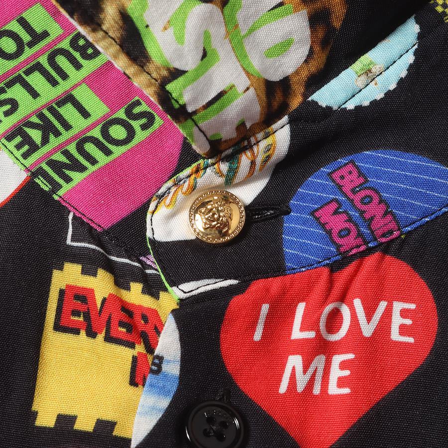 | 商品説明 | レーヨン生地を使用し、ボタンタイプで仕上げたシャツです。全体にメッセージアイコンを散りばめたデザインです。トップボタンのみ金のメデューサボタンを採用しています。 |