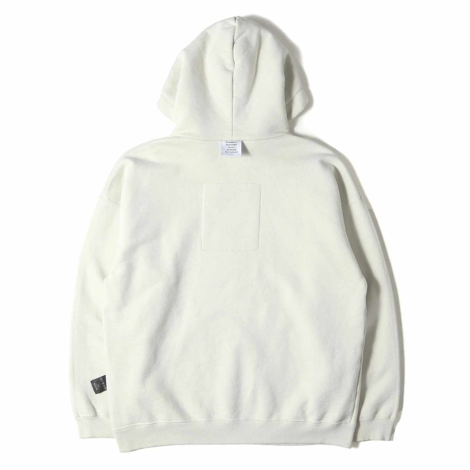 商品説明コットン/ポリエステル混紡生地を使用し、プルオーバータイプで仕上げたパーカーです。カンガルーポケットを裏地に、品質表示タグを表地に施したユニークなデザインです。左胸の反転ブランドロゴ刺繍がポイントです。
