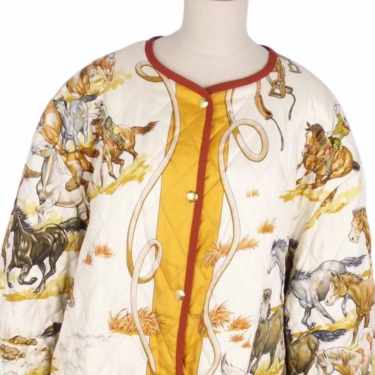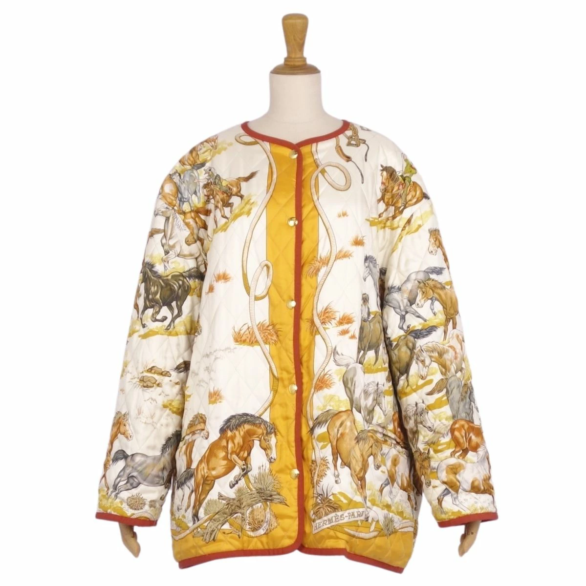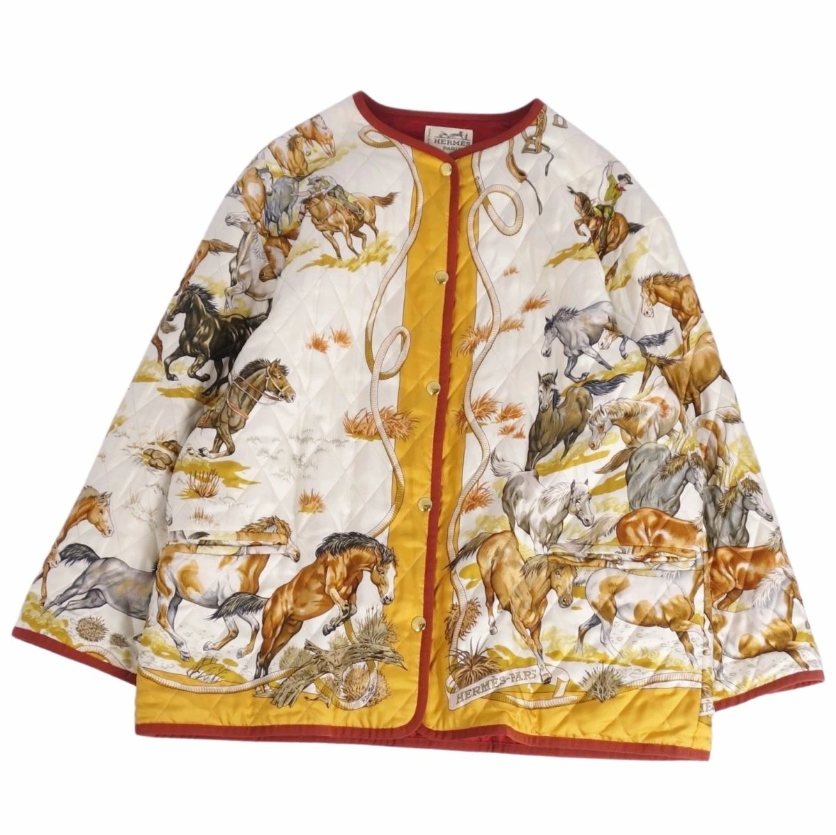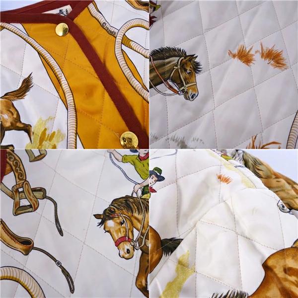 ■商品名Vintage エルメス HERMES ジャケット キルティング 中綿入り セリエボタン シルク100% 総柄 馬柄 ホース アウター レディース マルチカラー サイズ40(M相当)■状態説明・希少なVintage HERMES。上質なシルク素材を使用した中綿入りキルティングジャケットです♪・鮮やかなカラーリングと繊細なタッチで描かれた総柄模様が目を引くデザイン◎・フランス製・国内正規取扱品です。・数カ所汚れと袖に一箇所ステッチのほつれが御座いますが、ご使用に差し支えるようなものはなく全体的に良好な状態です!【季節感:秋冬】【付属品:なし】■素材表地:シルク100% 裏地:アセテート98% ポリエステル2% 中綿:ウール/ポリエステル■カラーマルチカラー■表記サイズ40(M相当)■実寸サイズ着丈:約72cm身幅:約62cm肩幅:約54cm袖丈:約53cm■状態ランクB 傷や汚れがあるが、まだまだ使用可能な状態■店舗管理番号ce06ol-rm10f13312womens_multi womens_m