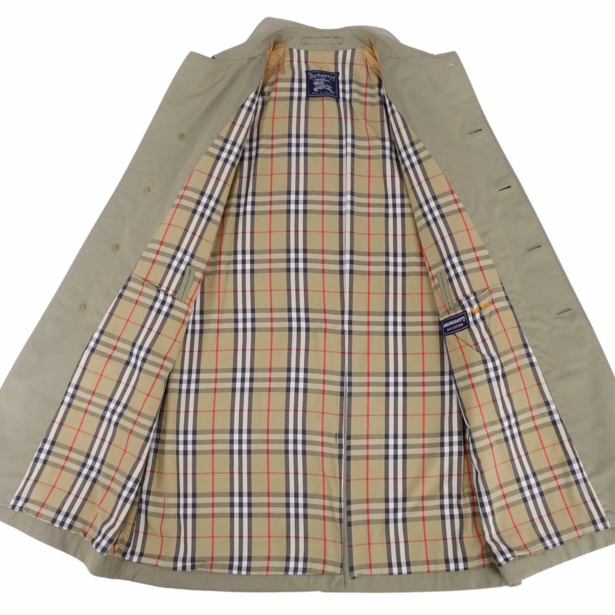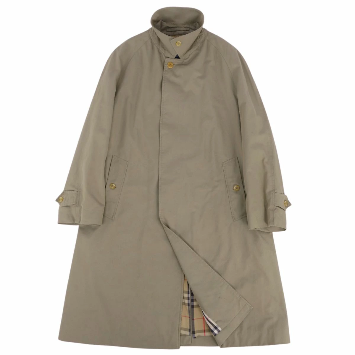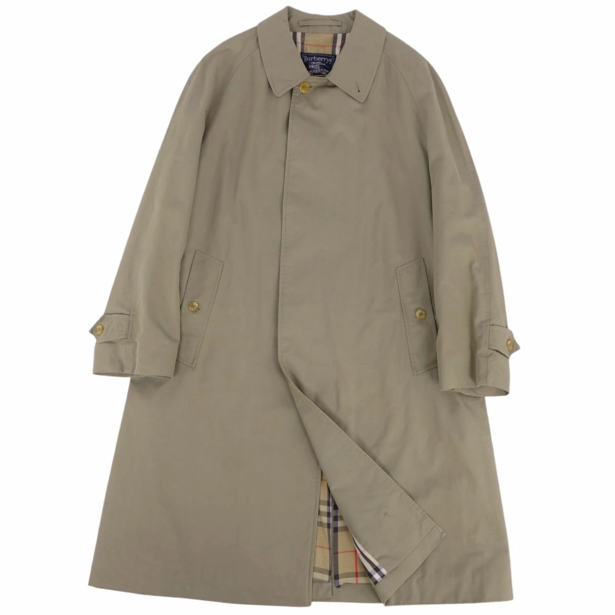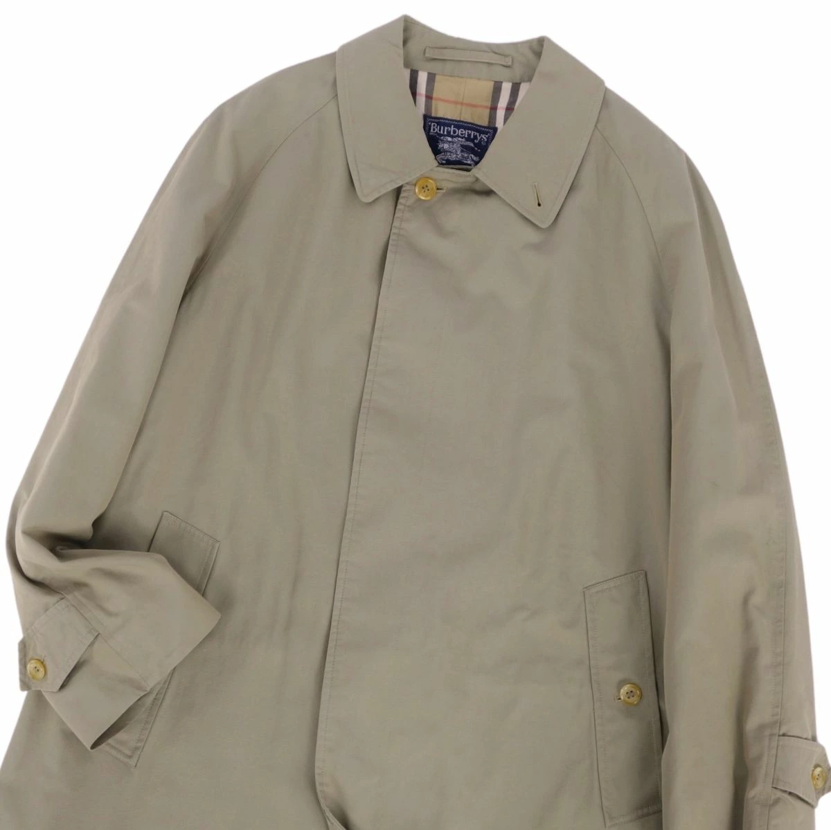 ■商品名Vintage バーバリー Burberrys コート ステンカラーコート バルマカーンコート 裏チェック 英国製 アウター メンズ カーキベージュ サイズS■状態説明・希少かつ絶大な人気を誇る1980年代頃のVintage Burberrys、クラシカルで美しいシルエットが魅力的なステンカラーコート(バルマカーンコート)です♪・表地はコットン100%バーバリークロス、裏地はアイコニックなチェックデザイン。肩パットなしの美しいショルダーラインです◎・イングランド製・前立裾付近に黒ずみ汚れが御座いますが、ご使用に差し支えるものはなく全体的に良好な状態です!・裏地にネーム刺繍が御座います。【季節感:秋冬春】【付属品:なし】■素材表地:コットン100% 裏地:コットン ポリエステル■カラーカーキベージュ■表記サイズS■実寸サイズ着丈:約100cm身幅:約56cmゆき丈:約82cm袖丈(脇下から):約39cm■状態ランクB 使用感はあるが傷や汚れの少ない良好な状態■店舗管理番号cf01dt-rm05f08626mens_khaki mens_s