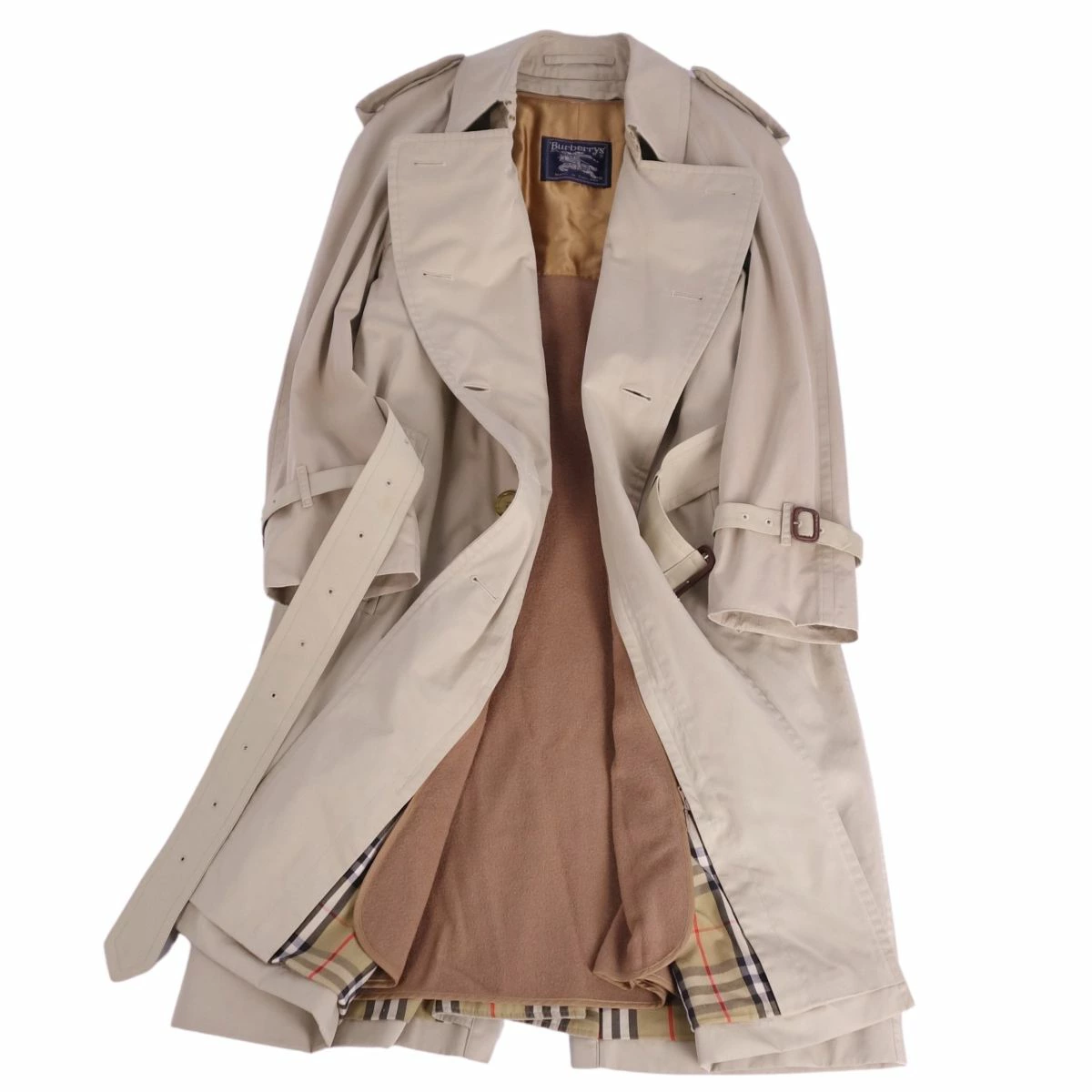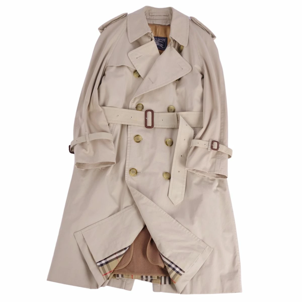 ■商品名Vintage バーバリー Burberrys コート 英国製 ライナー付き トレンチコート コットン100% 裏チェック アウター メンズ ライトベージュ サイズ46■状態説明・希少かつ絶大な人気を誇る1980年代頃のVintage Burberrys、クラシカルで美しいシルエットが魅力的な王道トレンチコートです♪・表地はコットン100%バーバリークロス、裏地はアイコニックなチェックデザイン、肩パットなしの美しいショルダーラインです◎・イングランド製・ウエストベルトや袖口ベルトに汚れが御座いますが、ご使用に差し支えるようなものはなく全体的に良好な状態です!【季節感:秋冬】【付属品:なし】■素材表地:コットン100% 裏地:コットン/ポリエステル ライナー:ウール■カラーライトベージュ■表記サイズ46■実寸サイズ着丈:約108cm身幅:約54cmゆき丈:約83cm袖丈(脇下から):約40cm肩幅(エポレット~エポレット):約51cm■状態ランクAB 使用感があるが、傷や汚れの気にならない状態■店舗管理番号ce07mt-rm20e32187mens_beige mens_m