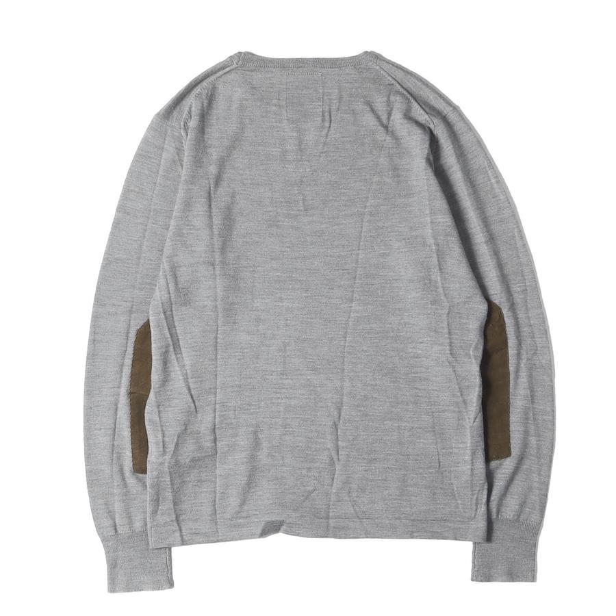 コーデュロイ素材のエルボーパッチをあしらったウール/シルク/カシミヤ混紡の薄手のクルーネックニットになります。
