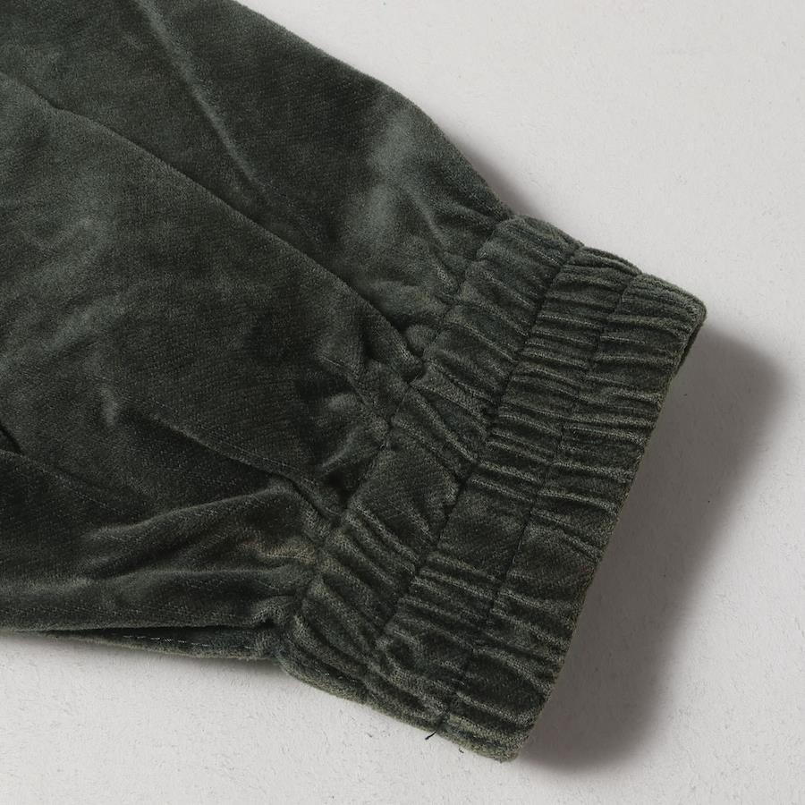 - 両面にロゴ刺繍をあしらったベロア素材のフルジップフードジャケットになります。