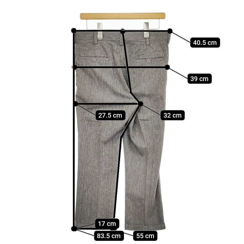| 実寸サイズ | 総丈:約83.5cm ウエスト:約40.5cm 股上:約32cm 股下:約55cm ヒップ:約39cm ワタリ幅:約27.5cm 裾幅:約17cm ※記載以外のサイズが合わないことを理由とした返品はできませんので、 記載部分以外で実寸サイズの気になる箇所があれば必ず購入前にご質問ください。 |