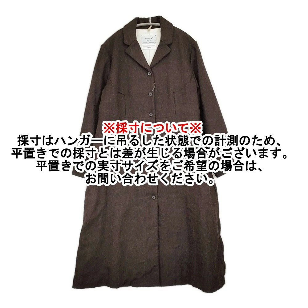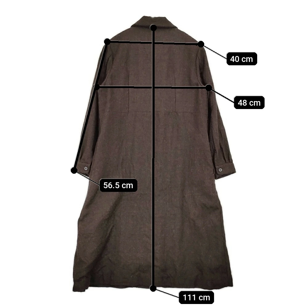 | 実寸サイズ | 肩幅:約40cm 着丈:約111cm 身幅:約48cm 袖丈:約56.5cm 備考 裏地:袖にはなし ※採寸画像がある商品はハンガーに吊るした状態での計測のため、平置きでの採寸とは差が生じる場合がございます。平置きでの実寸サイズをご希望の場合は、ご購入前に必ずご質問ください。 ※記載以外のサイズが合わないことを理由とした返品はできませんので、 記載部分以外で実寸サイズの気になる箇所があれば必ず購入前にご質問ください。 |