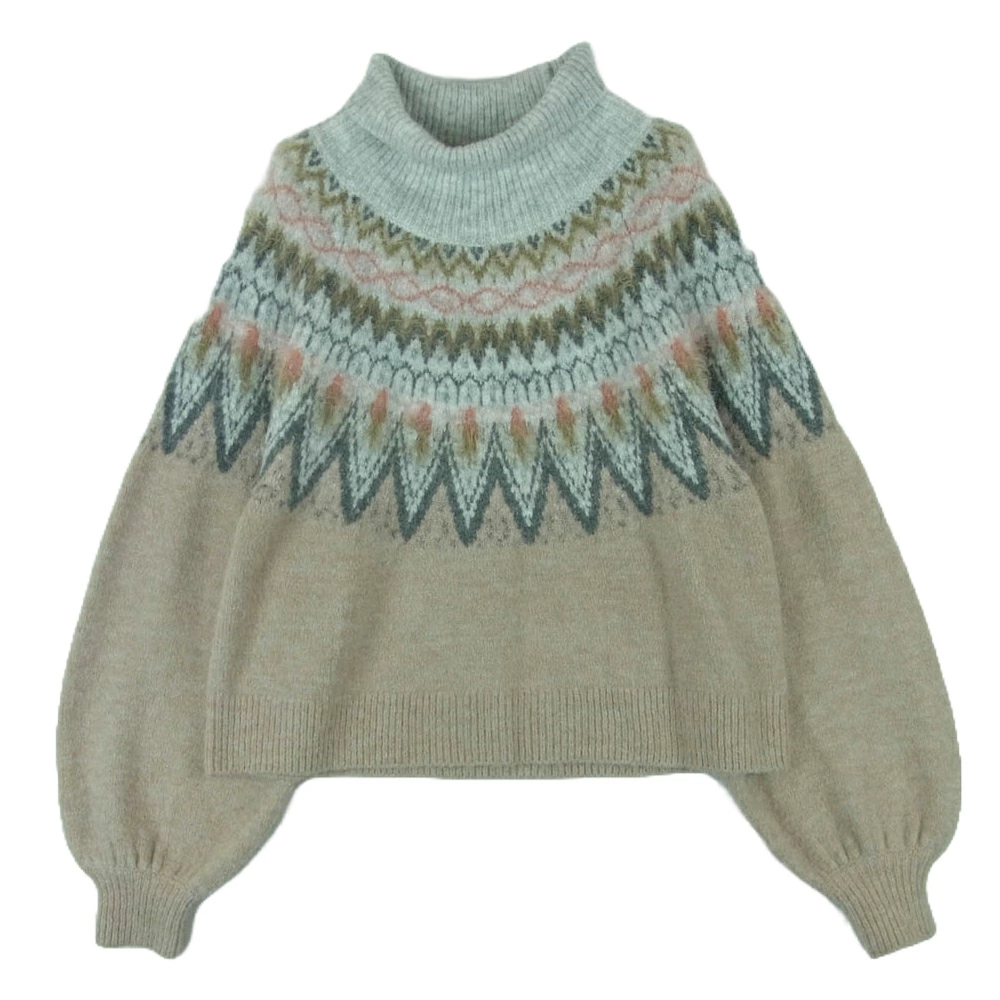 YANUK Fair Isle Knit, 57133955, High-Neck Knit, Made in China, Beige/Gray, Size F, Women's, Pre-owned